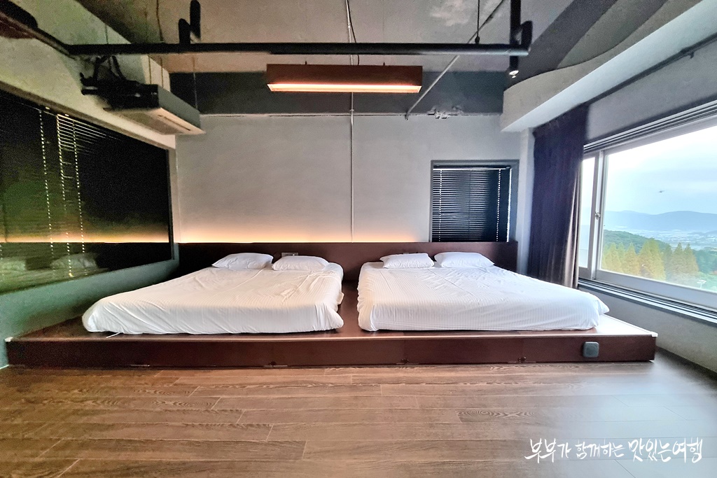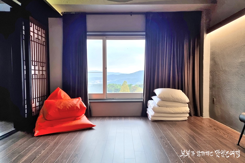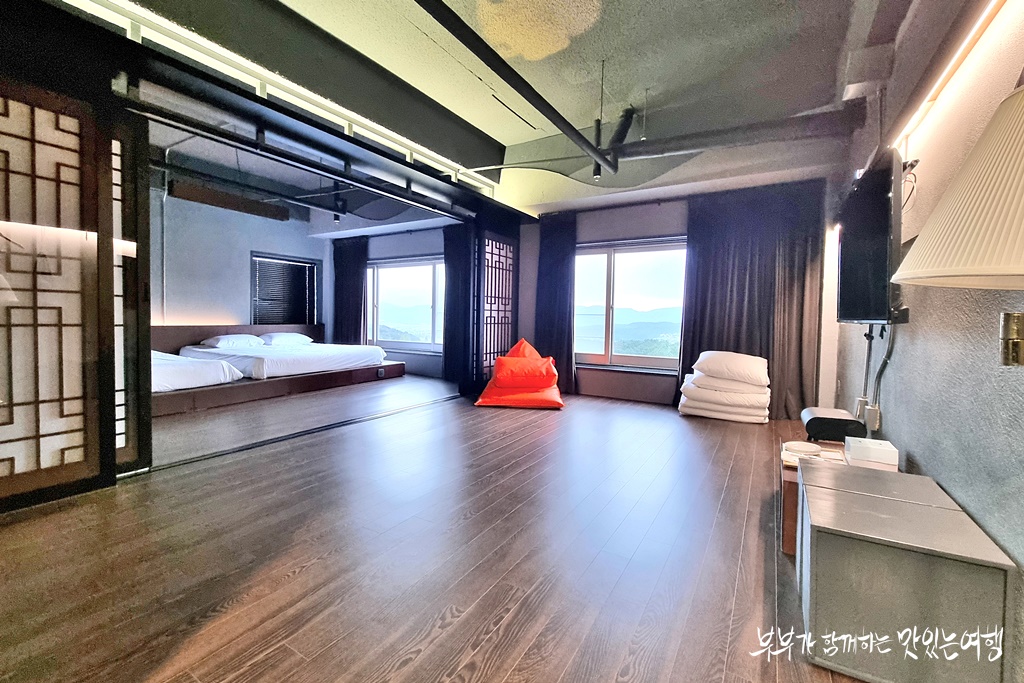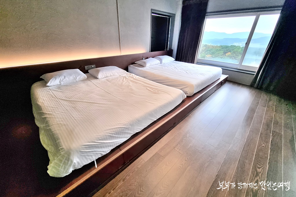 킹 사이즈급의 침대 두 개와 넓다란 온돌로 구성되어 4인 가족이 머물기에 더없이 적합하지 않나 싶은데요.