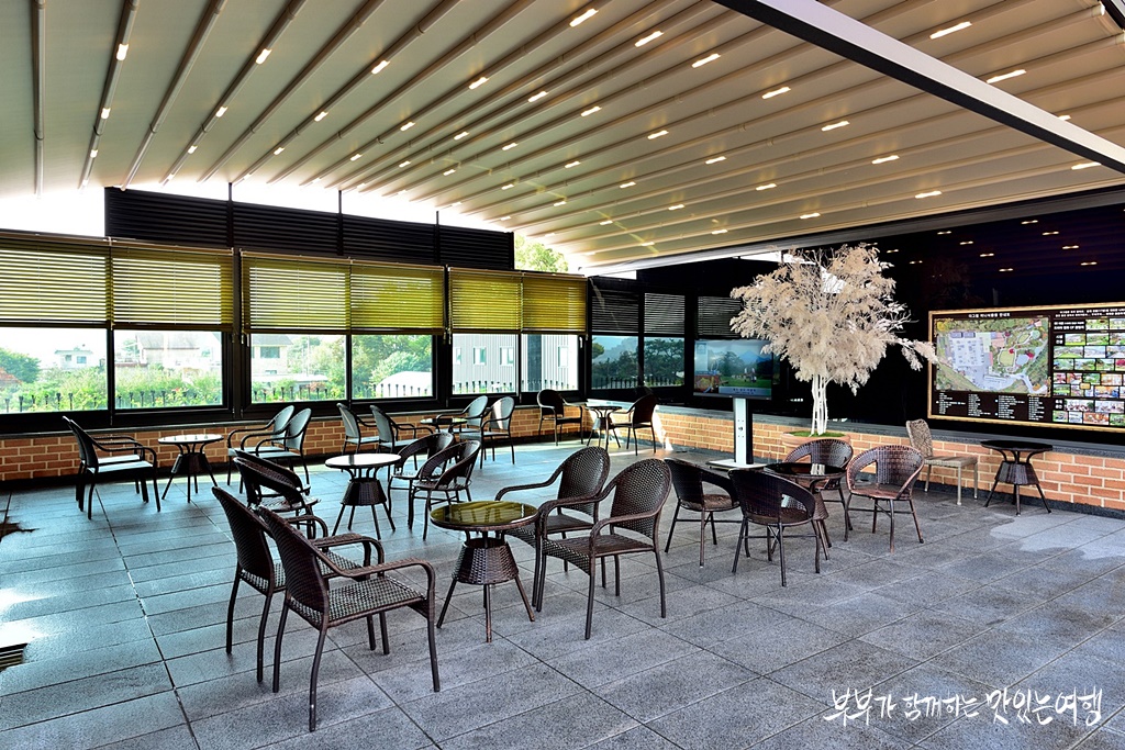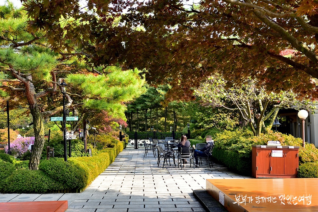 야외 여러 곳에 테이블과 의자를 갖추고 아름다운 정원 풍경과 함께 여유로움을 안겨줍니다.