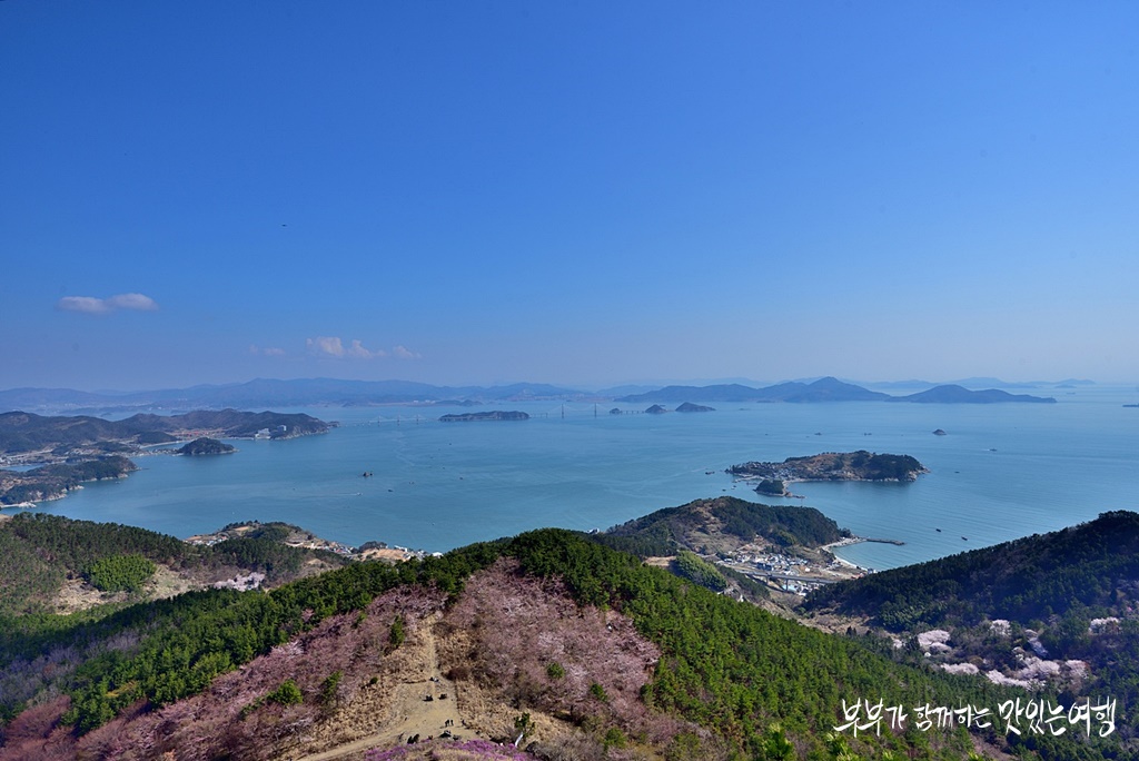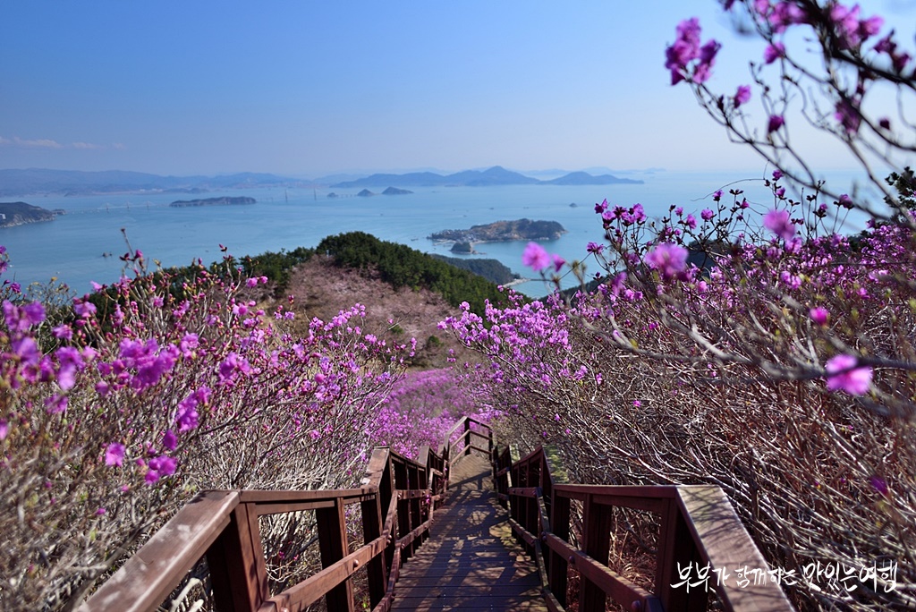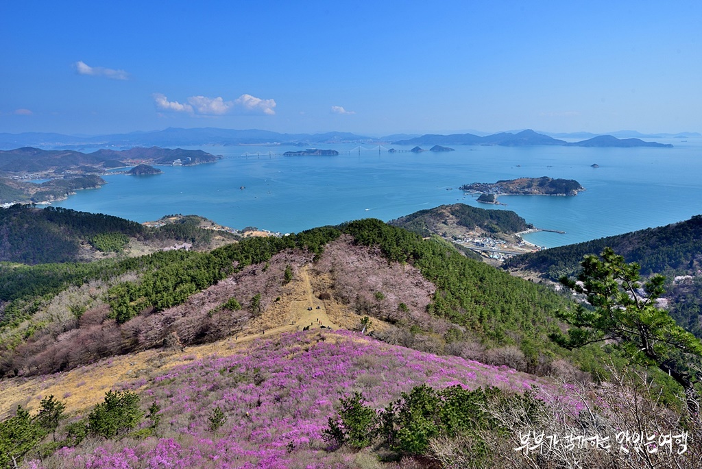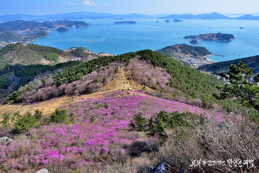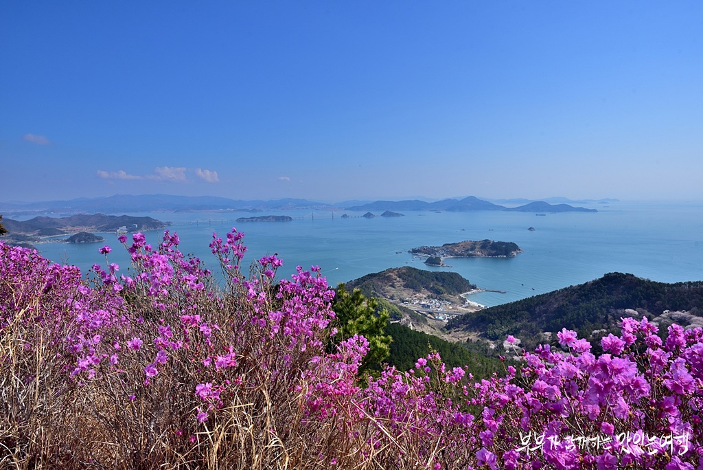 진하게 물든 진달래의 물결이 남해의 한려수도와 어우러지면서 황홀한 풍경을 만들죠.