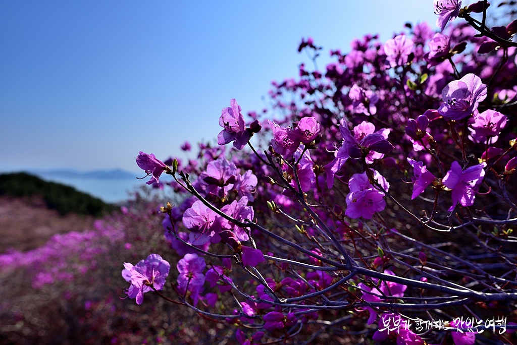 진달래 너머로 펼쳐지는 그림 같은 바다 풍경을 바라보며 한없는 상념에 빠져봅니다.