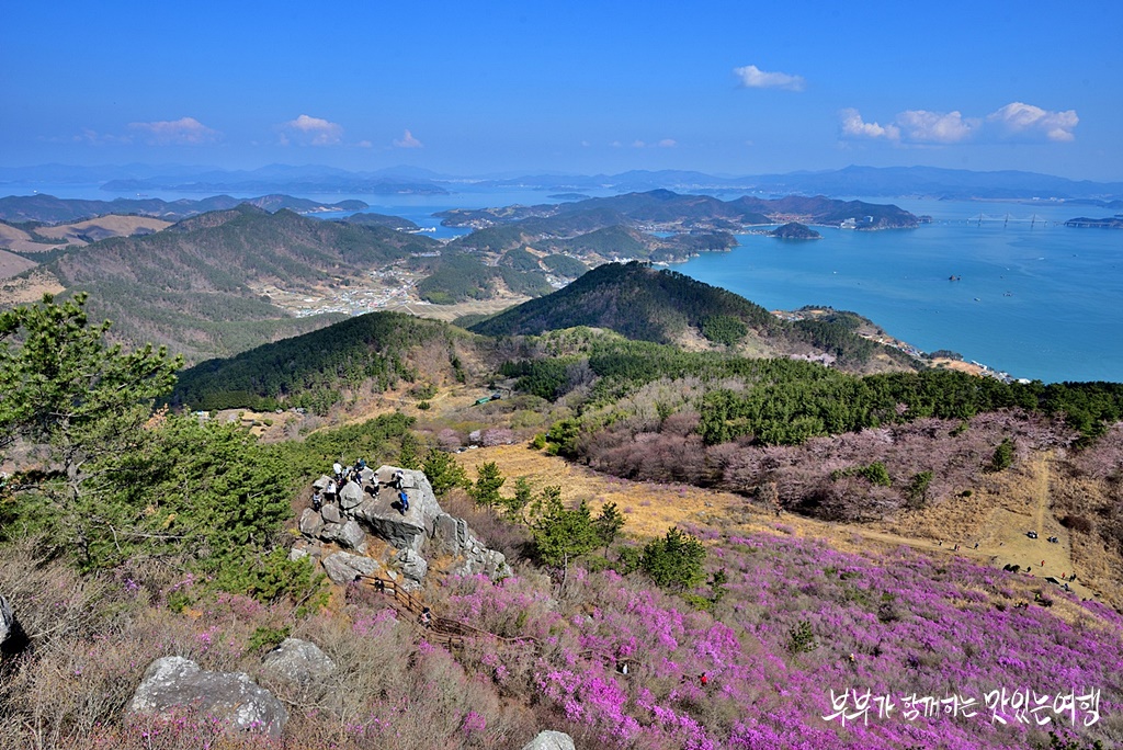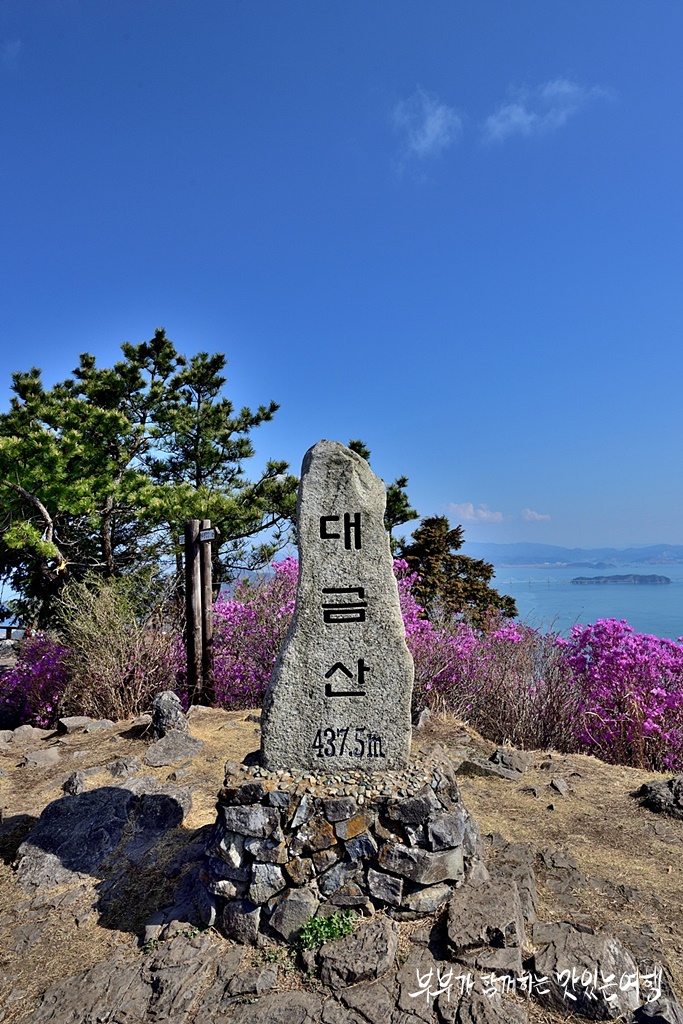 대금산이 자랑하는 진달래 군락지와 그 너머로 남해안의 아름다운 바다 풍경이 조화롭게 어우러지죠.