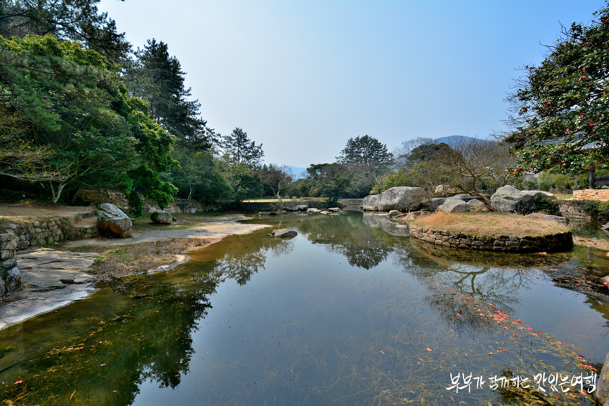 정자에서 바라보는 연못의 운치와 주변을 가득 메운 동백꽃의 조화가 너무나도 아름다운 곳이랍니다.
