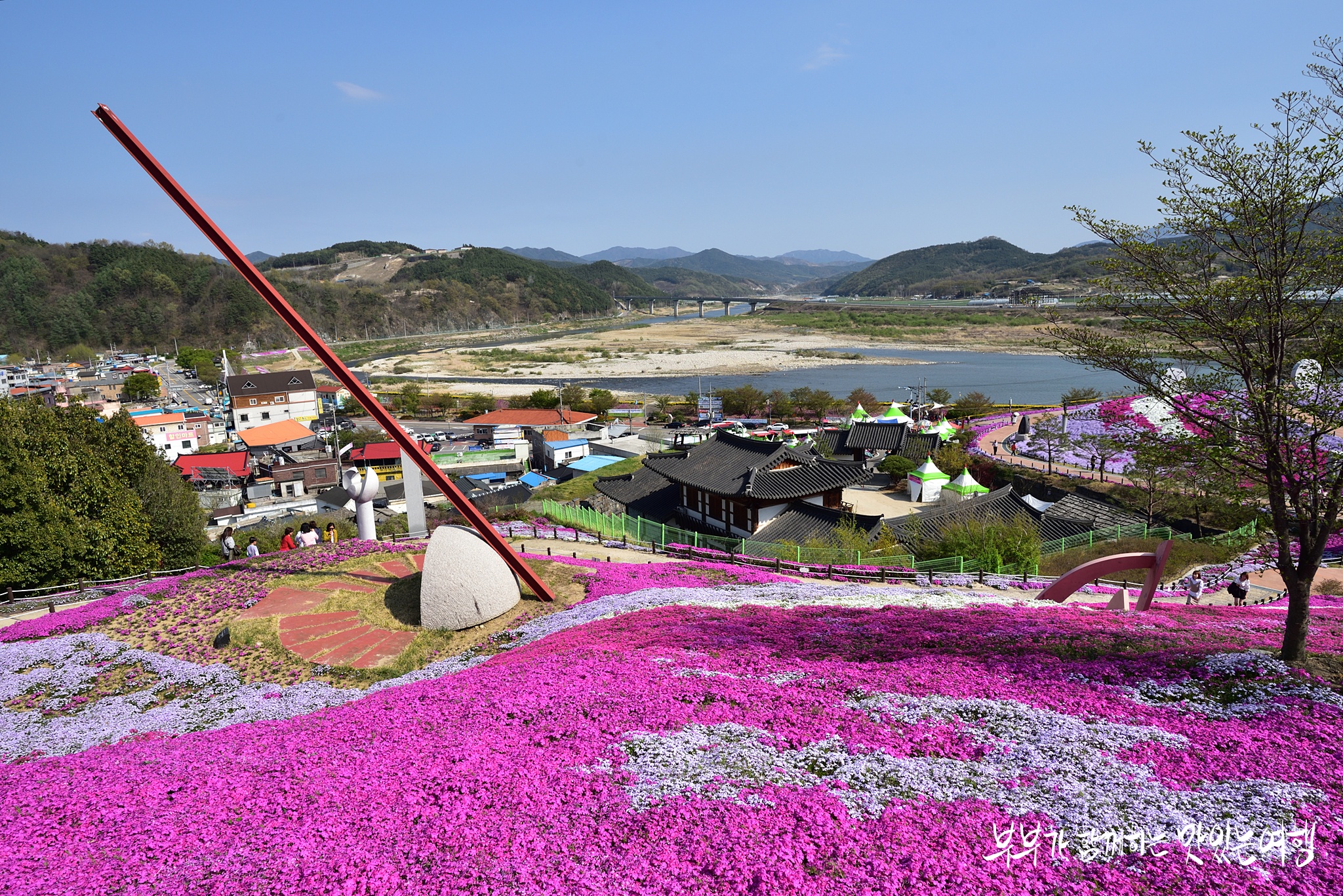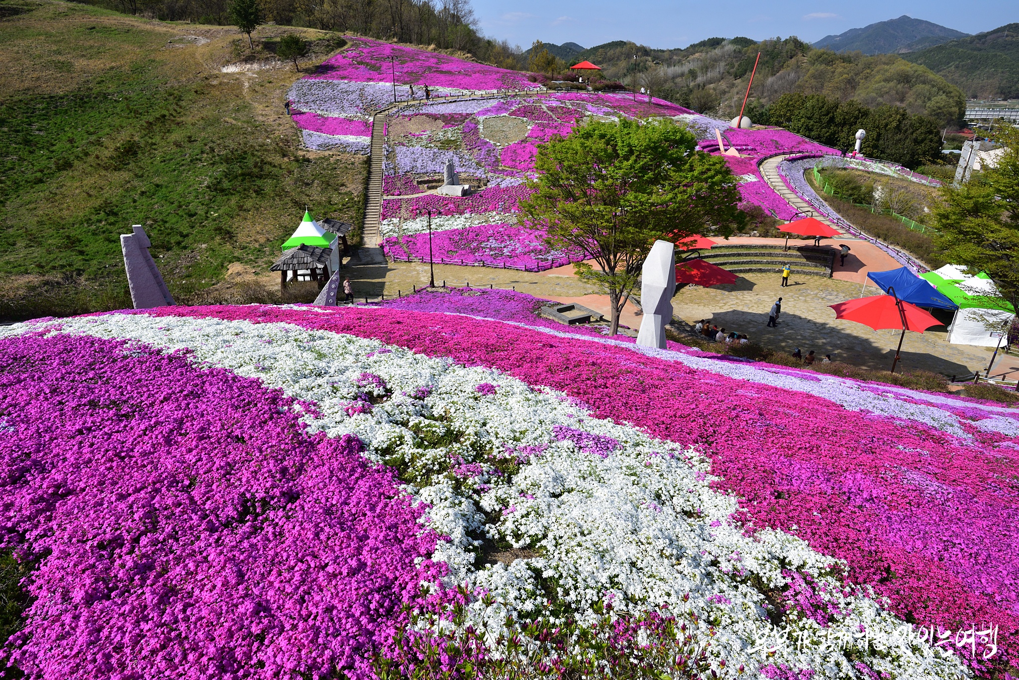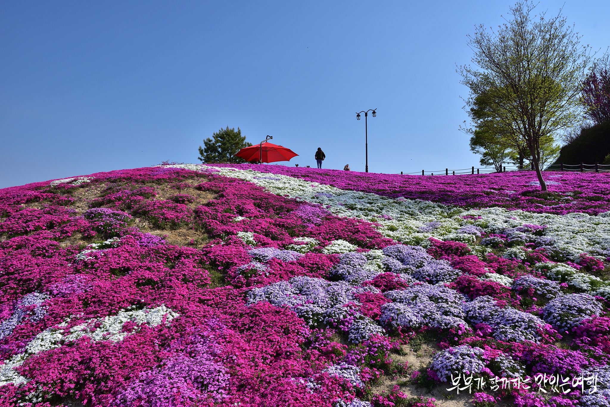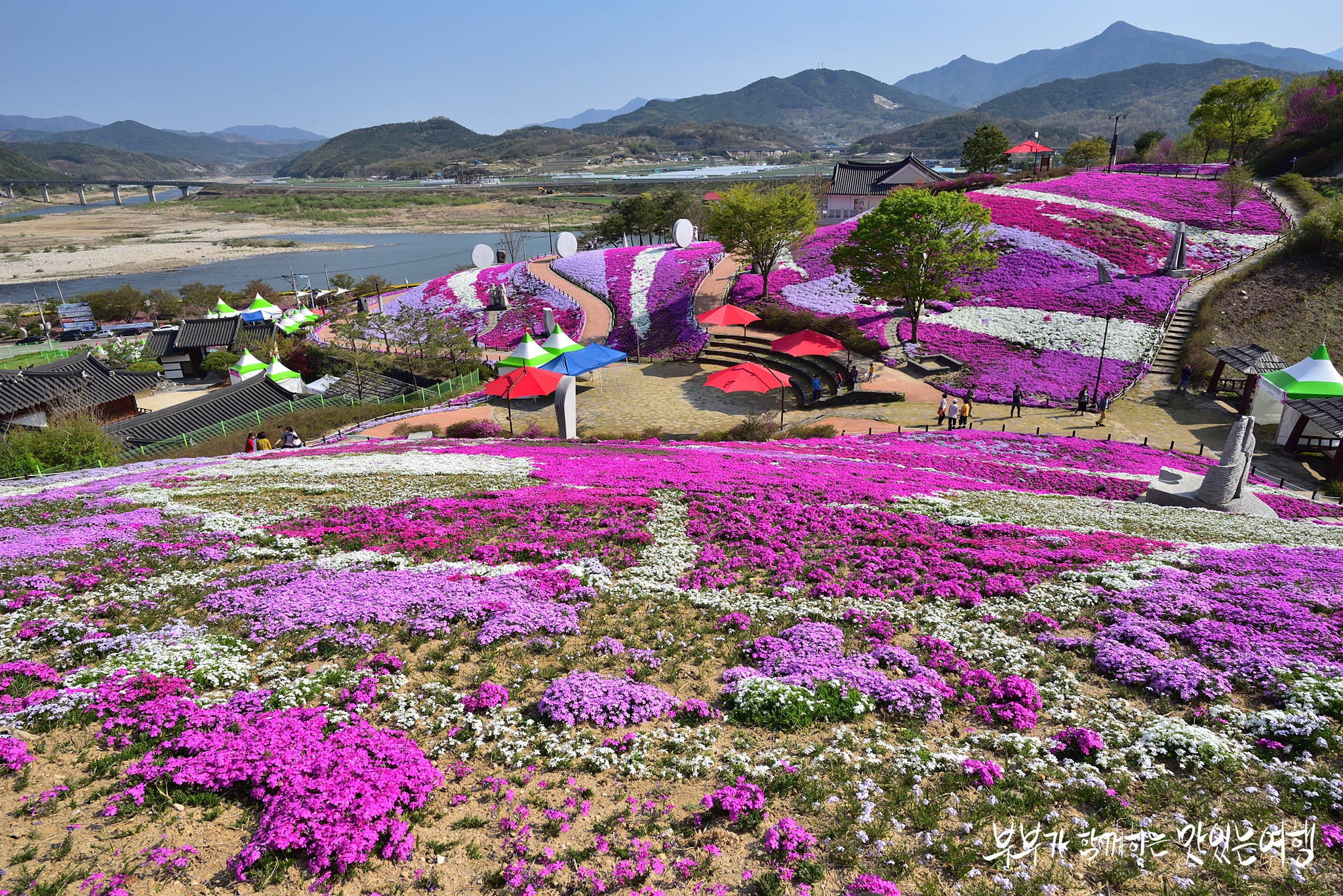 단일 크기로는 국내 최대인 2만 5000㎡ 규모의 언덕과 둑길을 뒤덮은 진분홍의 꽃잔디는 마치 융단을 펼쳐놓은 듯 합니다.