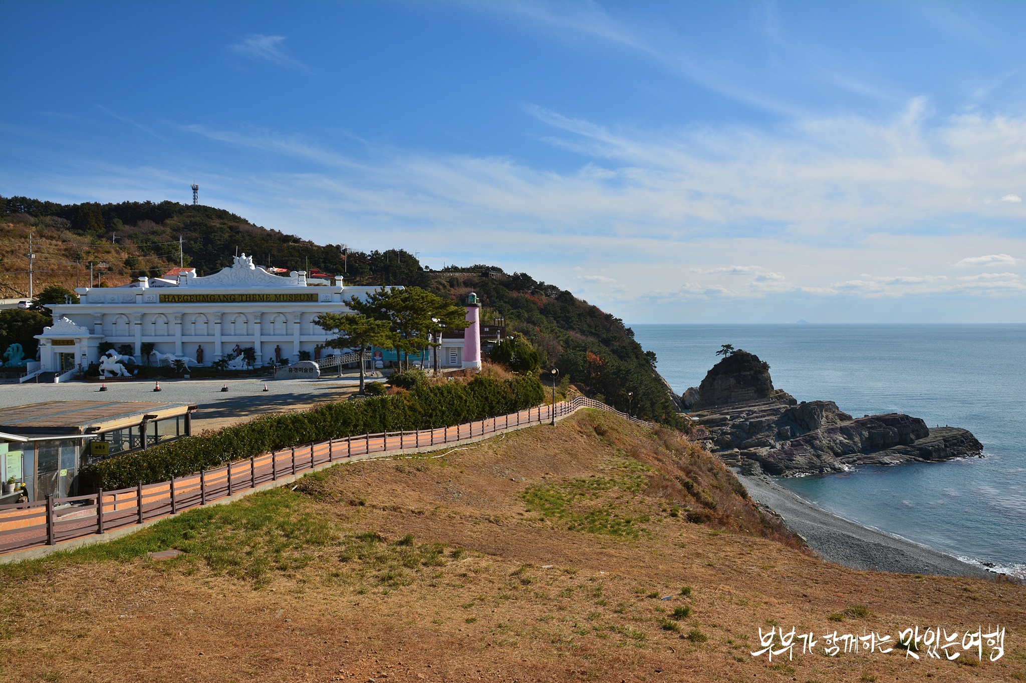 아름답기로 손꼽히는 해금강에서 바람의 언덕과 등을 맞대고 자리하고 있죠.