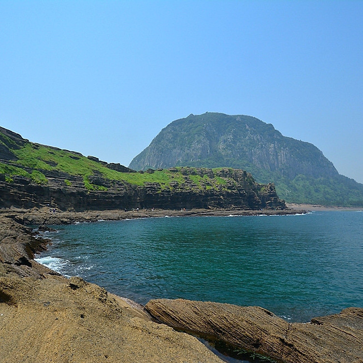 성산일출봉과 그 뒤로 보일듯 말듯한 우도가 자리잡고 있고 푸른바다를 끼고 멋스럽게 펼쳐지는 해안선의 진풍경이 연출됩니다.